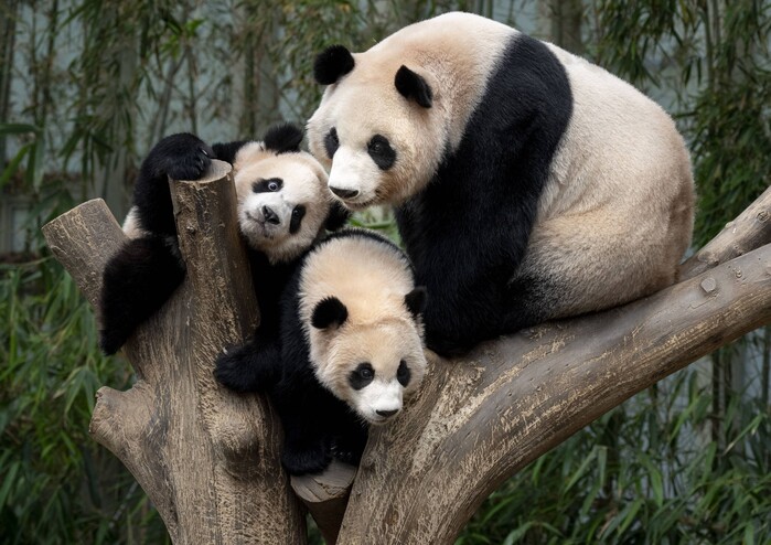 | ▲ 엄마 아이바오와 쌍둥이 판다 루이바오(위), 후이바오(아래).(사진=에버랜드 제공) |