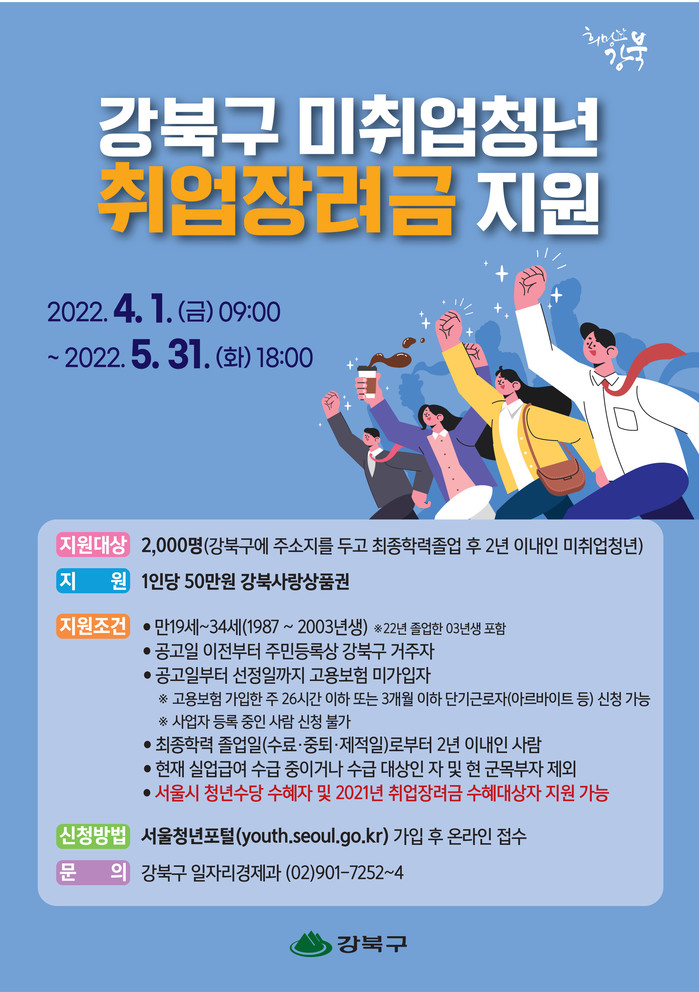 [시민일보 = 박준우 기자] 서울 강북구(구청장 박겸수)가 1일부터 오는 5월31일까지 취업난 속에 경제적 어려움을 겪고 있는 미취업 청년들을 위해 '취업장려금'을 지원한다.