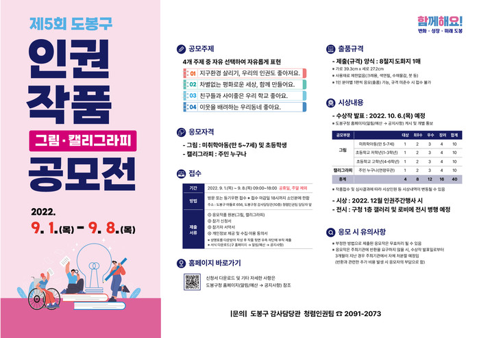 [시민일보 = 박준우 기자] 도봉구(구청장 오언석)는 인권감수성 향상 및 인권존중 문화 조성을 위해 '제5회 도봉구 인권작품(그림, 캘리그라피) 공모전'을 개최한다.