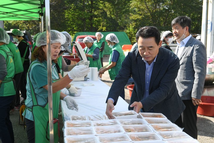 경기 포천시새마을부녀회는 지난 1일 소외이웃 300여명을 위해 포천시청소년새마을봉사단 학생들과 함께 ‘우리동네 행복밥상’ 밑반찬 나누기 행사를 개최했다. 사진은 행사에 참여한 백영현 시장(앞쪽 오른쪽)이 밑반찬을 정리하고 있는 모습. (사진제공=포천시청)