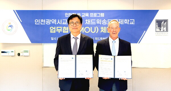 [인천=김형만 기자] 인천시교육청은 9월 25일 채드윅송도국제학교와 인천형 IB프로그램과 교원 연수 프로그램 상호협력을 위한 업무협약(MOU)’을 채드윅송도국제학교에서 맺었다고 밝혔다.