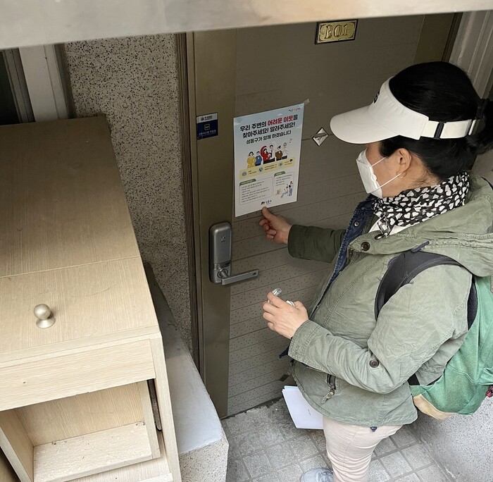 | ▲ 반지하 가구에 복지사각지대 발굴 홍보물을 부착하고 있는 위기가구 촘촘발굴단. (사진=성동구청 제공) |