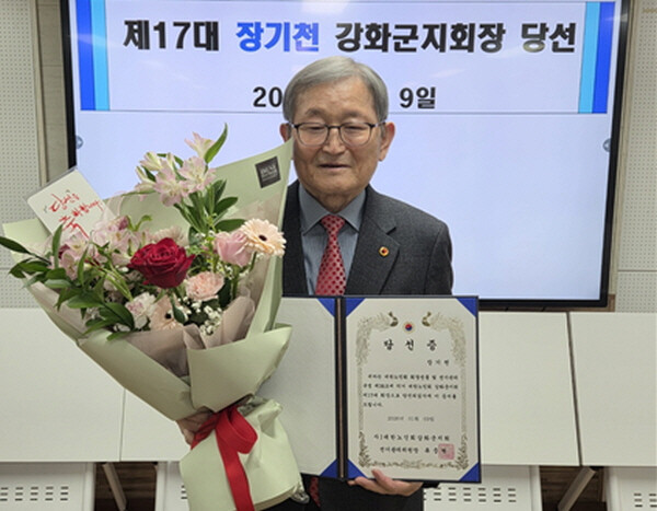 | 제17대 지회장에 당선된 장기천 회장이 당선증을 받은 후 기념 촬영을 하고 있다. [사진=대한노인회 강화군지회] |