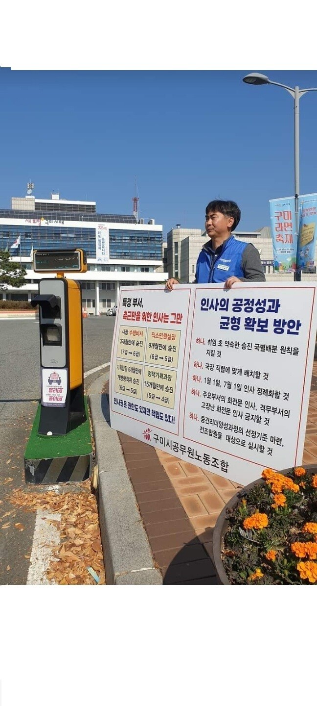 [구미=박병상 기자] 경북 구미시공무원노동조합 곽병주 위원장은 최근 구미시의 인사에 시정을 요구하는 1인 시위를 했다.