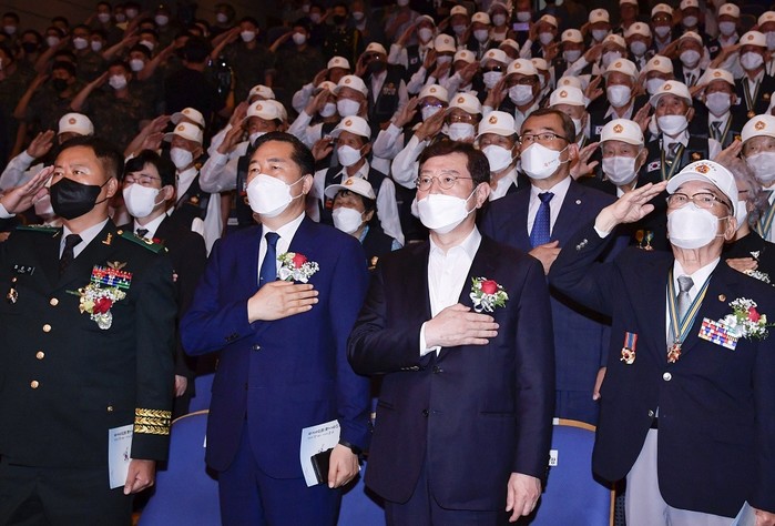 [광주=정찬남 기자] 이용섭 광주광역시장이 25일 오전 남구 빛고을시민문화관에서 열린 6·25전쟁 제72주년 행사에 참석해 참전유공자 등 내빈들과 국민의례를 하고 있다./광주광역시 제공