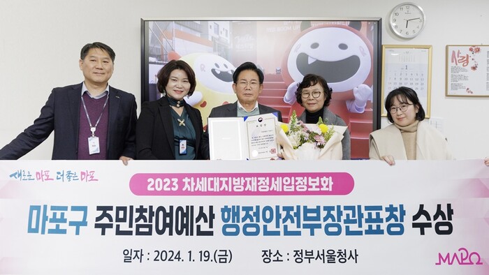 [시민일보 = 홍덕표 기자] 마포구(구청장 박강수)는 최근 행정안전부 주관 ‘2023년 차세대지방재정세입정보화 유공 포상’에서 우수 지방자치단체로 선정돼 행정안전부장관 표창을 받았다고 22일 밝혔다.