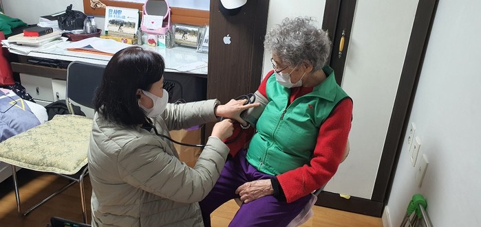 | ▲ 마을간호사가 홀몸노인 가구를 방문해 건강상태를 체크하는 모습. (사진제공=성동구청) |