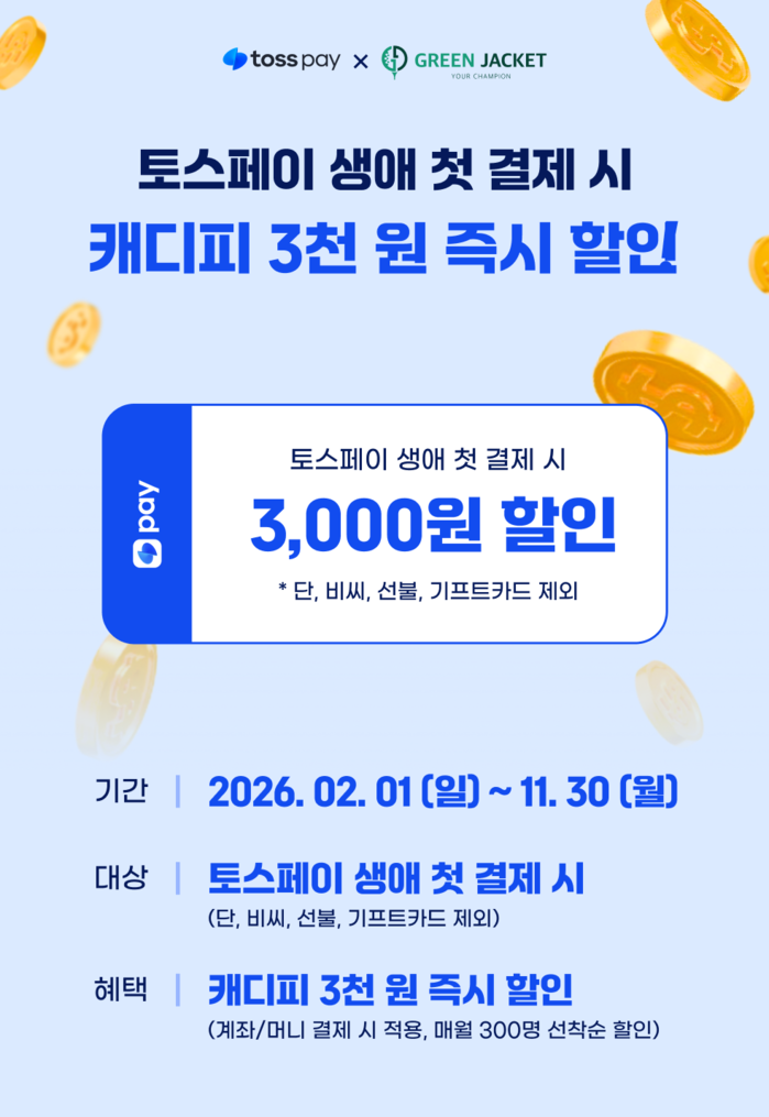 ㈜그린재킷 임시아 대표는 “이번 토스 이벤트는 단순한 할인 제공을 넘어, 캐디피 비대면 결제를 처음 경험하는 고객이 부담 없이 서비스를 이용할 수 있도록 설계했다”며 “앞으로도 골프장 현장에서 체감할 수 있는 결제 편의성과 이용 경험을 중심으로 금융·결제 혜택을 지속 확대해 나갈 계획”이라고 말했다.