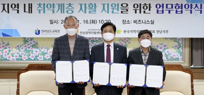 전남도교육청이 16일 한국지역자활센터협회전남지부, 전남광역자활센터와 건강한 교육환경 조성과 지역내 저소득 취약계층의 성공적인 자립·자활 지원을 위한 업무협약을 체결했다. 협약에 따라 3개 기관은 코로나19 지속으로 어려움을 겪고 있는 지역내 저소득 취약계층의 자립과 자활을 위한 인적·물적 자원 활용 정보를 교환하고 연계한다. 사진은 장석웅 교육감(가운데)이 양 기관 관계자들과 협약서를 들고 기념촬영을 하는 모습. (사진제공=전라남도교육청)