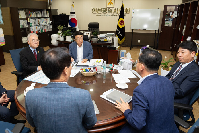 | ▲ 간담회에 참석한 허식 의장(가운데)이 참여자들과 의견을 나누고 있다. (사진=인천시의회 제공) |