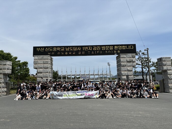 | ▲ 부산신도중학교 학생 및 학교 관계자, 지난 15일 강진 푸소 체험 방문 기념촬영 / 강진군 제공 |