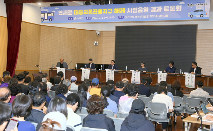 앞서 구는 지난 13일 오후 2∼4시 창천교회 백주년기념관 맑은내홀에서 지역주민과 상인, 관련 분야 전문가 등 200여명이 참석한 가운데 연세로 대중교통전용지구 해제 시범운영 결과 토론회를 개최했다.