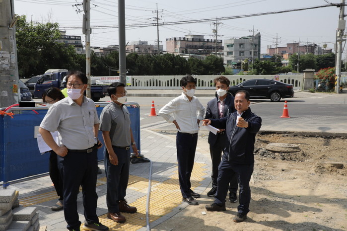 김현광 경기 수원시 팔달구청장이 최근 매산동 도시재생사업지 및 재개발구역 일대 등 지역내 주요 공사현장에 대해 안전한 보행환경 등 주민불편사항을 예방하기 위해 현장점검을 실시했다. 사진은 이날 김 구청장(오른쪽)과 관계자들이 현장을 점검하고 있는 모습. (사진제공=팔달구청)