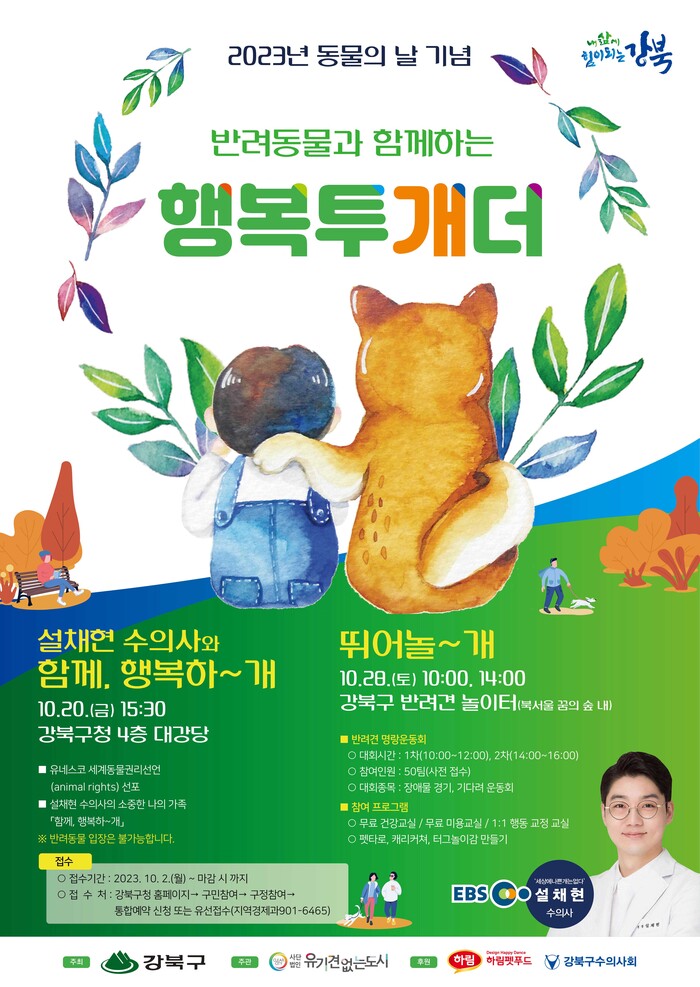 [시민일보 = 홍덕표 기자] 서울 강북구(구청장 이순희)는 오는 20일 구청 대강당에서 2023년 동물의 날 기념행사(주제: 행복투개더, 강북!)를 개최한다고 밝혔다