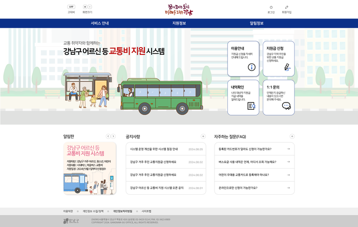 구는 이를 위해 지난해 보건복지부와 사회보장제도 신설 협의를 마치고 '서울시 강남구 어르신 등 교통비 지원에 관한 조례'를 제정하고, 지난 3월 시스템 구축기관을 선정했다.