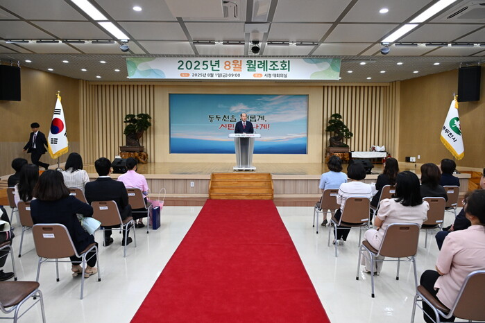 경기 동두천시가 1일 시청 대회의실에서 8월 명예시장으로 위촉된 윤문희 동두천중·고등학교 총동문회장과 전직원이 참석한 가운데 월례조회를 개최했다. 사진은 월례조회에 참석한 박형덕 시장이 발언하고 있는 모습. (사진=동두천시청 제공)