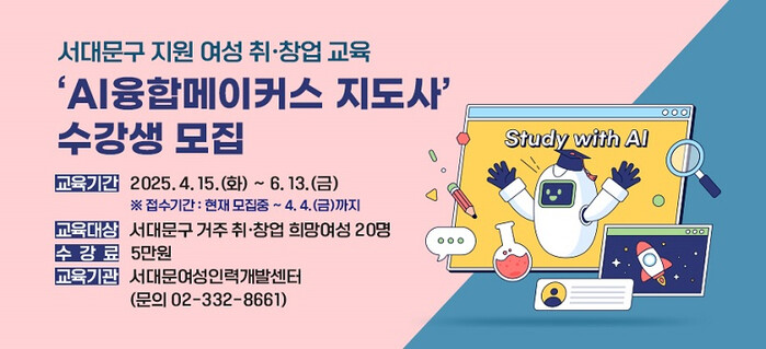 교육 대상은 20명, 수강료는 5만 원이며 희망자는 구비서류(주민등록등본, 반명함판 사진)를 갖고 4월 4일 오후 6시까지 서대문여성인력개발센터(신촌역로 10 혜우빌딩 4층)로 방문 신청해야 한다.
