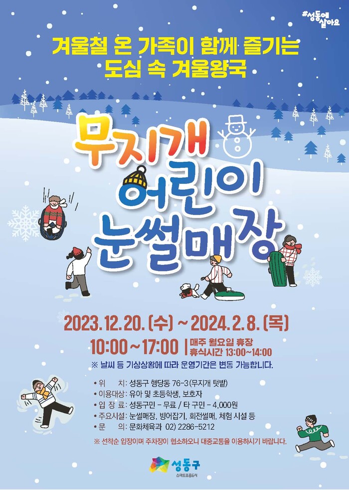 [시민일보 = 홍덕표 기자] 서울 성동구(구청장 정원오)가 20일 가족이 함께 즐길 수 있는 '무지개 어린이 눈썰매장'을 처음으로 개장하고 2024년 2월8일까지 운영한다.