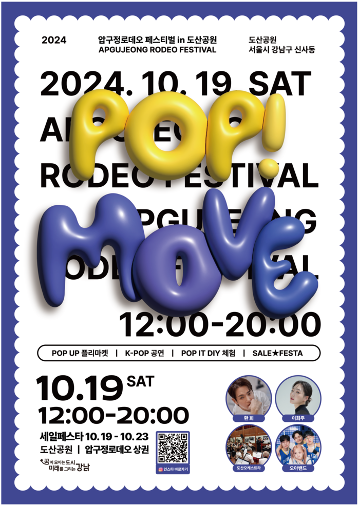 구는 매년 상권 활성화를 위해 압구정로데오 상인들과 손잡고 다양한 축제를 기획하고 있다. 이번 축제는 ‘POP! MOVE’를 슬로건으로 내세워, 압구정로데오 상권 그 자체를 하나의 팝업 콘셉트로 구현했다.
