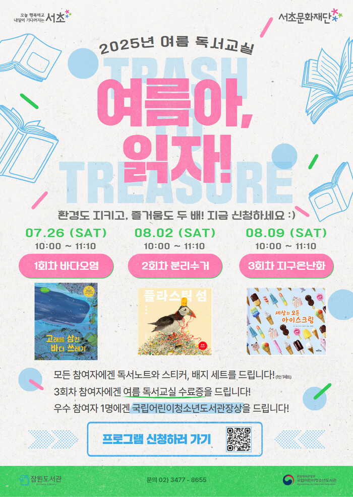 [시민일보 = 박소진 기자] 서초구(구청장 전성수)와 서초문화재단은 여름방학을 맞아 잠원도서관에서 오는 7월 26일부터 8월 9일 까지 기후 환경 독서 프로그램 ‘여름아, 읽자!’를 운영한다.