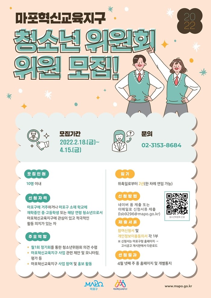 구에 거주하거나 마포구 소재 학교에 재학 중인 중·고등학생 또는 해당 연령 청소년이면 누구나 청소년위원에 지원할 수 있다.