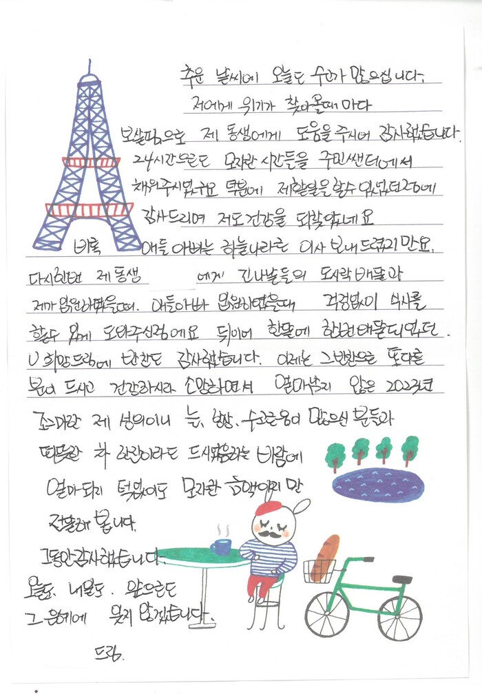 가양3동 희망드림단을 통해 지난 4월부터 밑반찬을 받고 있던 지역주민의 가족인 송씨는 편지를 통해 동주민센터와 희망드림단 덕분에 장애가 있는 동생을 돌볼 수 있었다며 감사 인사를 전했다.