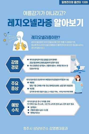 급성 호흡기 질환인 ‘레지오넬라증’은 3급 법정 감염병으로 병원성 레지오넬라균(Legionella species) 감염에 의해 발생하며 연중 발생하지만, 특히 여름철에 발생이 증가하는 감염병이다.