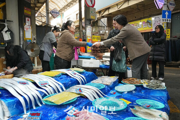 | ▲ 신수정 광주광역시의장이 말바우시장에서 설 명절 맞이 해산물을 구입하고 있다./ 광주광역시의회 제공 |