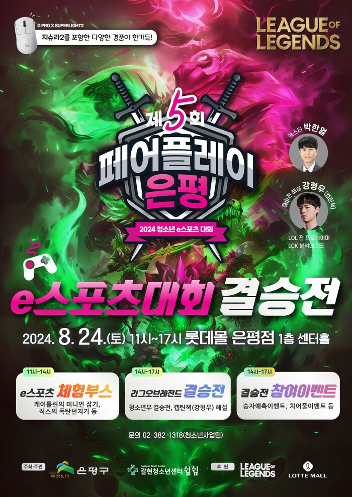 이날 열리는 결승전은 롯데몰 은평점 1층 센터홀에서 오후 2시부터 3판 2선승제로 진행된다. 현장 관람과 갈현청소년센터 유튜브 채널을 통해서 생중계된다. 결승전 생중계는 전 프로게이머 출신 강형우(캡틴잭)와 박한얼 캐스터, 청소년 해설이 함께한다.