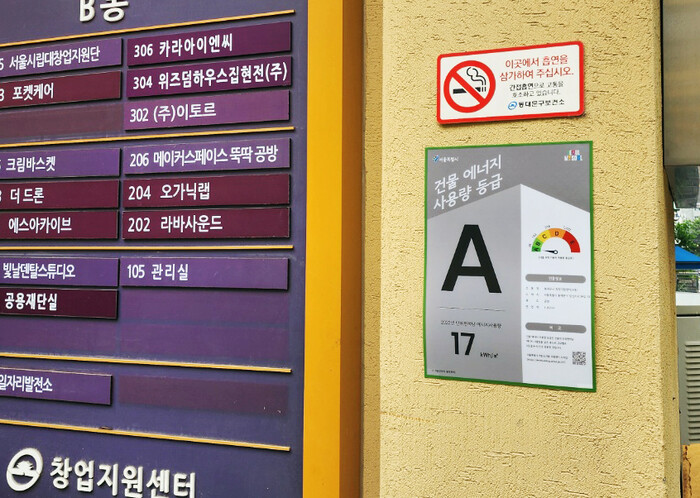 | ▲ 동대문구 창업지원센터에 부착된 건물 에너지 사용량 등급표. (사진= 동대문구청 제공) |
