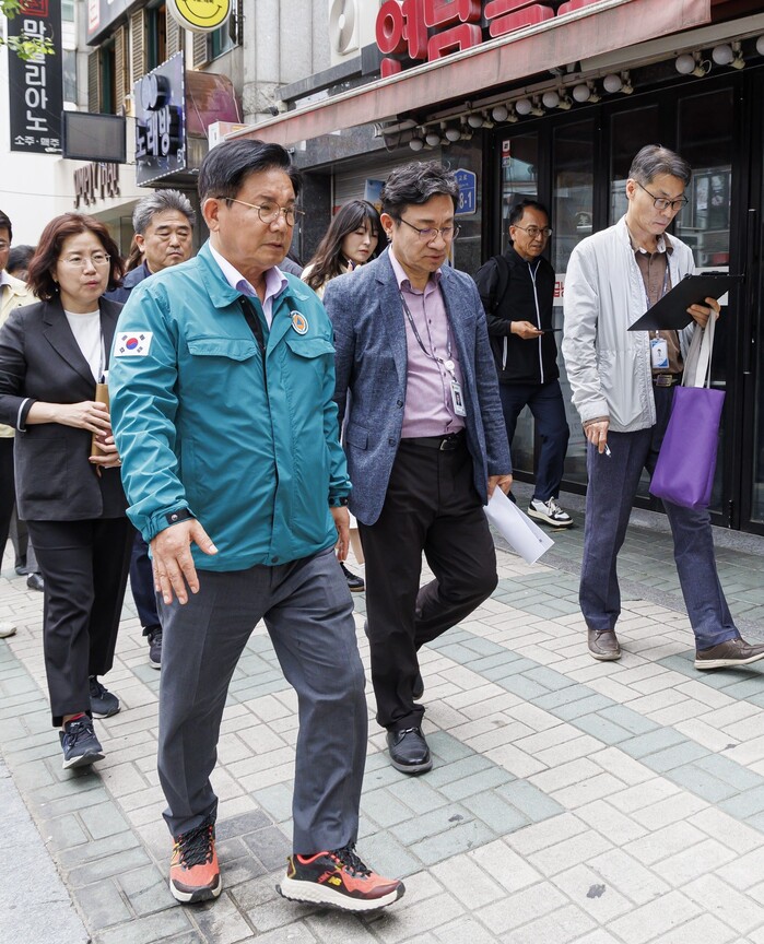 | ▲ 동교로 일대를 방문한 박강수 구청장(왼쪽)이 '끼리끼리 거리' 공사예정지를 살펴보고 있다. (사진=마포구청 제공) |
