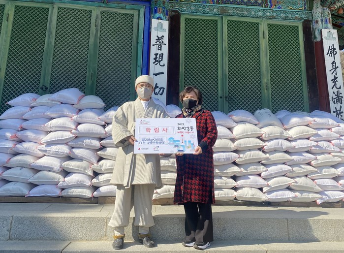 서울 노원구는 최근 상계동 수락산 학림사로부터 코로나로 어려움을 겪고 있는 이웃을 위한 쌀 20kg·265포(1400만원 상당)를 지원받았다. 구는 기부받은 쌀을 노원구푸드뱅크마켓을 비롯해 상계3,4동 등 기초생활수급자 265가정에 전달했다. 사진은 전달식에서 관계자들이 기념촬영을 하는 모습. (사진제공=노원구청)