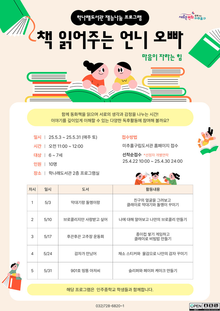 [인천=문찬식 기자] 인천 미추홀구 학나래도서관(이하 도서관)이 이달부터 인주중학교와 함께 지역 아동을 대상으로 ‘책 읽는 언니, 오빠-마음이 자라는 힘’ 프로그램을 운영한다고 7일 밝혔다.