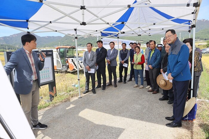 군은 18일 농림축산식품부 공모사업으로 선정된 ‘저탄소 벼 논물관리 기술보급 시범사업’사업대상지인 계곡면 방춘리 일원에서 벼수확과 함께 현장 설명회를 개최했다.