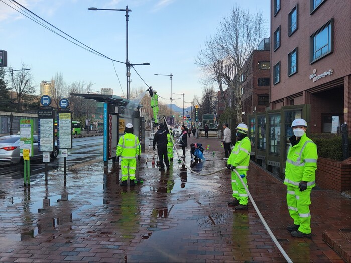 | ▲ 종로구가 새봄맞이 대청소의 일환으로 마로니에공원과 혜화역 일대를 청소했다. 사진은 혜화역 앞 버스정류장 물청소를 진행하는 관계자들의 모습. (사진=종로구청 제공) |