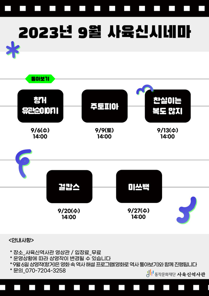 [시민일보 = 여영준 기자] 동작구(구청장 박일하)는 9월 양성평등주간(1~7일)을 맞아 오는 27일까지 사육신역사공원 내 사육신역사관(노량진로 191)에서 ‘사육신시네마’를 운영한다고 밝혔다.