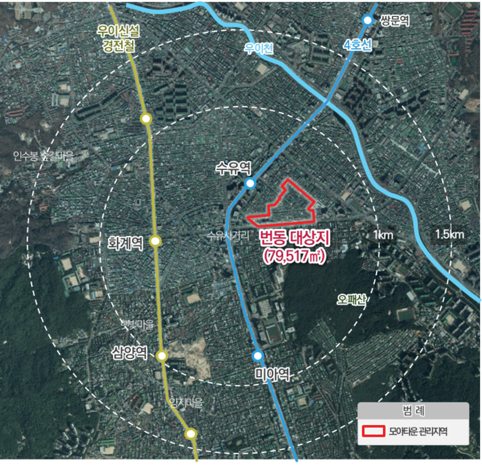 구 번동 454번지 일대(면적 7만897㎡)는 관리계획에 따라 모아주택 3곳이 추진되면, 우이천과 맞닿은 입지적 장점을 극대화한 쾌적한 주거환경이 조성된다.