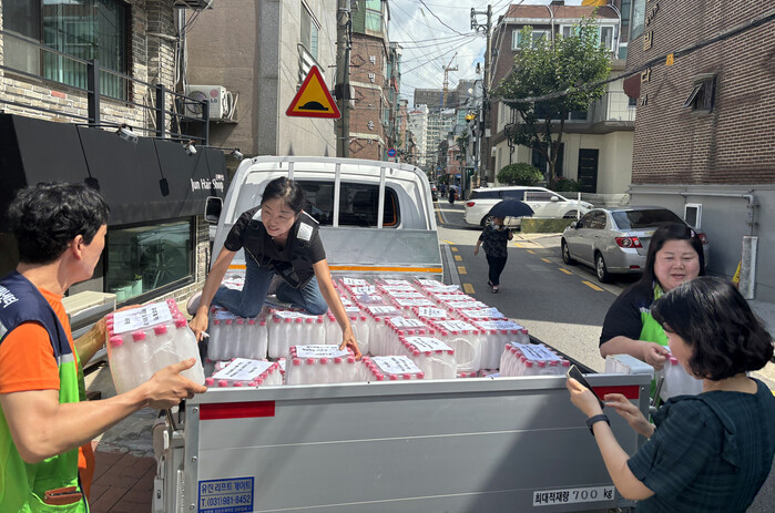 | ▲ 20일 서대문구가 지역내 수해 지역 주민들에게 아리수 얼음물을 배부하고 있다. (사진=서대문구청 제공) |