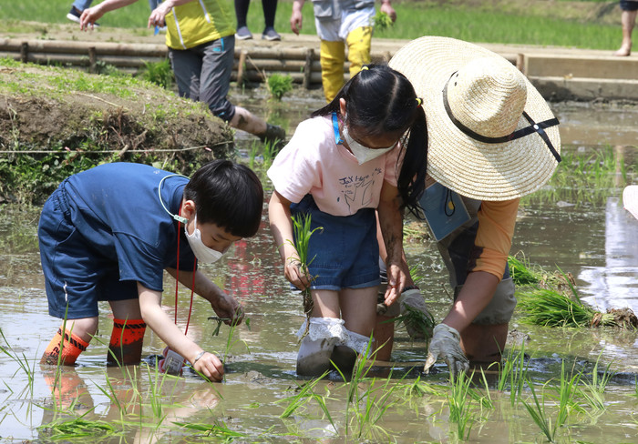 서울 강남구가 최근 양재천 벼농사학습장에서 ‘도심속, 양재천 전통 모내기 체험’ 행사를 개최했다. 이날 6~7세 꼬마농부학교 어린이 등 200여명이 참여해 1730㎡ 면적의 논에 못줄을 대고 모 하나하나를 일일이 손으로 심었다. 사진은 양재천 전통모내기 체험 행사에서 어린이들이 모를 심고 있는 모습. (사진제공=강남구청)