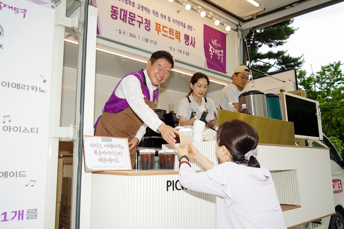 [시민일보 = 이대우 기자] 서울 동대문구(구청장 이필형)가 2024년도 하반기 첫 날인 1일 아침, 구청 앞 광장에 푸드트럭을 마련해 직원들을 격려했다.