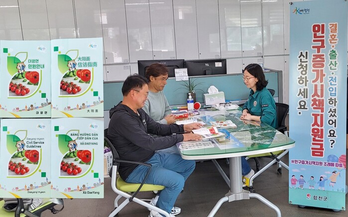 특히 대양면에서는 이선희 주무관이 직접 발벗고 나서서 합천군 가족센터와 외국어에 능통한 다문화 가정 및 지역주민과 협업해 적은 예산으로 다국어 생활민원 안내 책자를 한국어, 영어, 중국어, 베트남어 등 4개 국어로 제작하여, 지난달 20일부터 면사무소와 덕정리 마을회관 등 28개 회관과 합천군 가족센터에 배포해 누구나 이용할 수 있게 해 좋은 반응을 얻고 있다. 또한 다문화가정에는 면에서 직접 민원안내 책자를 전달하고 상세히 설명하기도 했다.