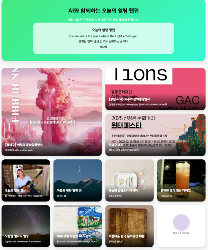 먼저 AI가 엄선한 긍정 메시지인 ‘힐링 명언’과 전 세계 명시를 감성적으로 해설한 ‘힐링 詩’는 문학적 사색을 제공한다. 메트로폴리탄 등 세계적 박물관의 작품을 설명하는 ‘AI 도슨트’와 검증된 영상을 레트로 감성으로 재해석한 ‘힐링 영상’은 시각적 즐거움을 더한다.