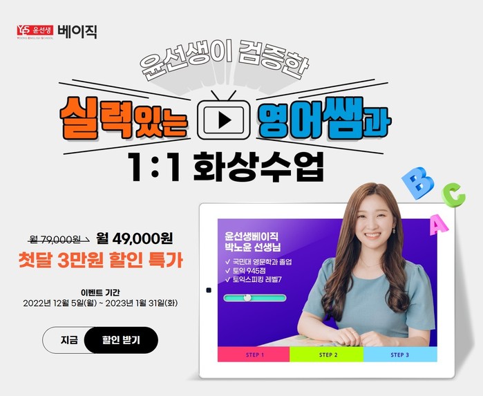 윤선생에 따르면 일대일 화상영어 브랜드 윤선생베이직은 오는 2023년 1월31일까지 가입한 신규 회원을 대상으로 첫 달 영어 학습비 3만원을 할인해준다.