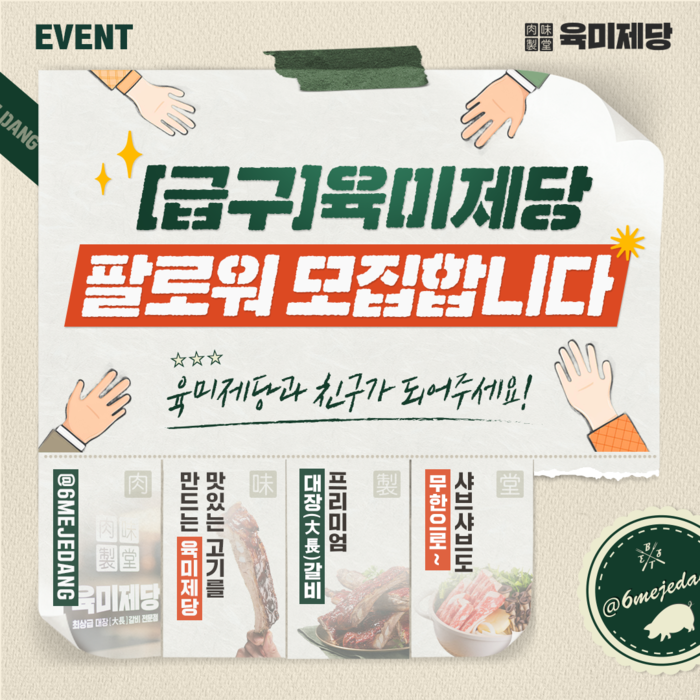 1월 10일(금) ~ 1월 13일(월)까지 진행되는 팔로우 이벤트는 육미제당 공식 인스타그램에서 참여 가능하다. 육미제당 인스타그램 계정을 팔로우 하고 이벤트 게시물 내 친구를 소환하여 댓글을 작성하면 참여가 가능하며 추첨을 통해 3명의 인원을 선정해 총 40,000원 상당의 1인 식사권 2매를 증정한다.