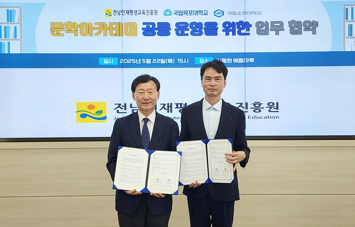 지난 5월 22일 국립목포대와 전남인재평생교육진흥원(원장 범희승)은 문학 아카데미 운영을 위한 업무협약(MOU)을 체결했으며, 협약식에는 국립목포대 김개영 문예창작 전공 교수가 참석했다.