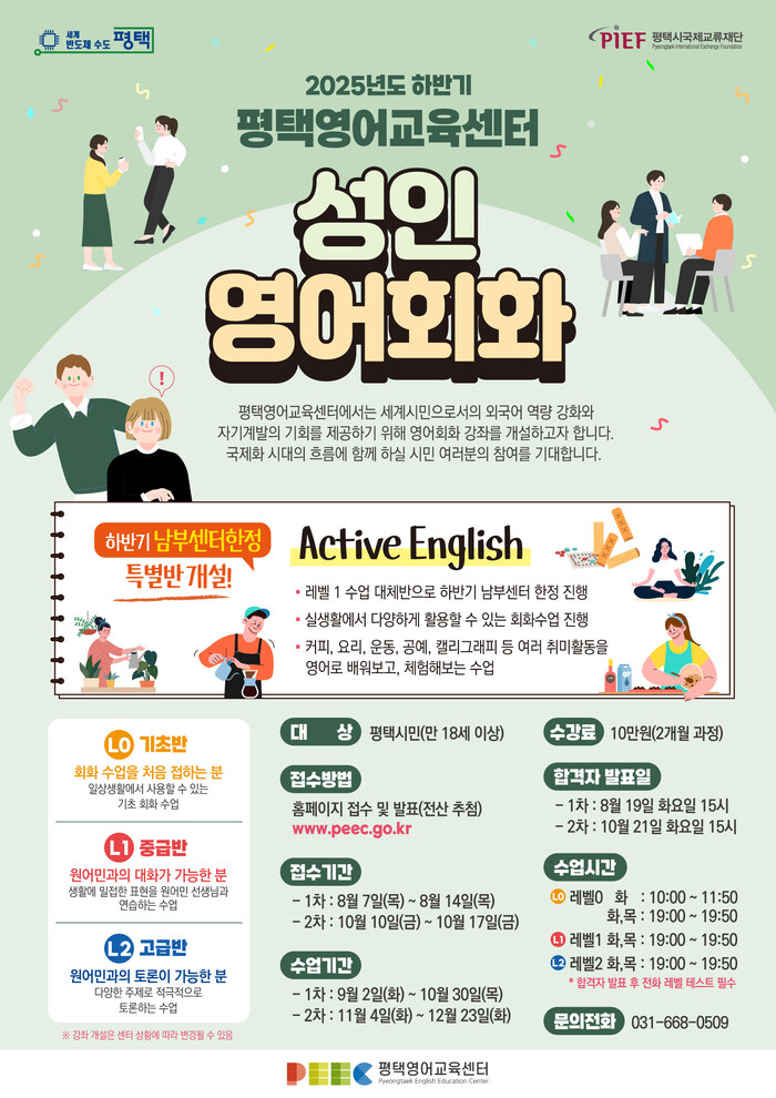 하반기 성인 영어 회화 프로그램 3기는 남부(팽성), 북부(장당), 서부(안중) 센터에서 각각 운영되며, 수강 신청은 8월 7일부터 14일까지 진행된다. 수업은 9월부터 2개월 과정으로 운영될 예정이다.