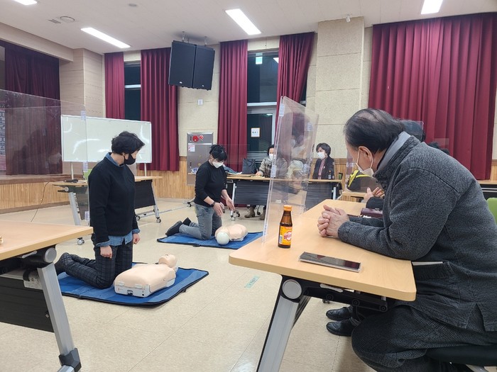 바르게살기운동 경기남양주시협의회 다산2동위원회가 최근 초빙 강사를 통해 ‘4분의 기적 심폐소생술 배우고 알리기’라는 주제로 심뇌혈관 응급상황 대처를 위한 심폐소생술 프로그램 교육을 실시했다. 사진은 이날 교육이 진행되고 있는 모습. (사진제공=남양주시청)