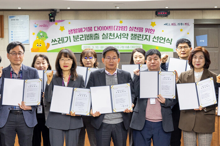 마포구는 지난 10일 마포구청 대회의실에서 ‘쓰레기 분리배출 실천 서약 챌린지 선언식’을 개최했다. 이번 선언식은 ‘생활폐기물 다이어트 천만 시민 실천 프로젝트’의 일환으로 마련됐다. 사진은 행사에 참석한 박강수 구청장(앞줄 가운데)과 간부 공직자들이 기념촬영을 하고 있는 모습. (사진=마포구청 제공)