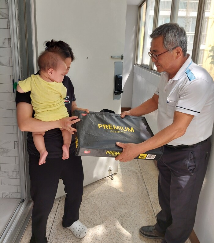 | ▲ 강릉 2차 사랑으로 부영 관리소장이 입주민에게 감사 선물을 전달하고 있다. (사진=부영그룹 제공) |