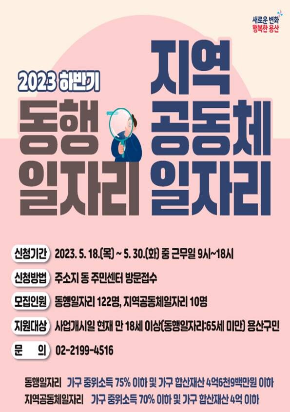 [시민일보 = 홍덕표 기자] 서울 용산구가 오는 30일까지 '2023년 하반기 동행일자리 사업'(옛 공공근로사업) 참여자를 모집한다.